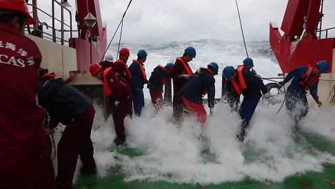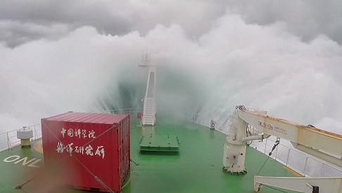在船上的54天里,我們布放了14套潛標(biāo),回收了11套潛標(biāo),累計(jì)布放803件,回收了294件,其中也包括我們所生產(chǎn)的ADCP。雖然我主要負(fù)責(zé)我們的設(shè)備,但也負(fù)責(zé)了所有的潛標(biāo)布放,而在布放的過程中,最常見的天氣就是高溫炎熱,因?yàn)榇耙恢痹诔嗟栏浇鳂I(yè),所以船甲板溫度在40度以上,我們常常頂著毒辣的太陽在甲板上布放,也讓布放增加了難度,而還有個(gè)自然因素就是以迅雷不及掩耳之勢(shì)襲來的暴雨,我們經(jīng)常在暴雨中連續(xù)作業(yè),全身都濕透了,也只能頂著暴雨堅(jiān)守戰(zhàn)地。而值得一提的是當(dāng)大風(fēng)以20m/s速度襲來時(shí),浪花直接拍到了6層駕駛室的玻璃上,仿佛將要把我們吞沒,此時(shí)看著浩瀚無邊的海洋,一道道波浪不斷涌來,撞擊在船體上,發(fā)出天崩地裂的吼聲,噴濺著雪白的泡沫。是那樣的壯觀。當(dāng)一切都回歸平靜的時(shí)候,又是那樣的云淡風(fēng)輕。