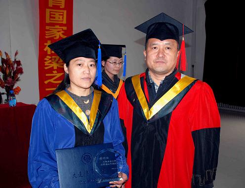海大信息科學(xué)技術(shù)學(xué)院副院長曹德信(右)為學(xué)員李娜頒發(fā)碩士學(xué)位證書及紀(jì)念牌。
